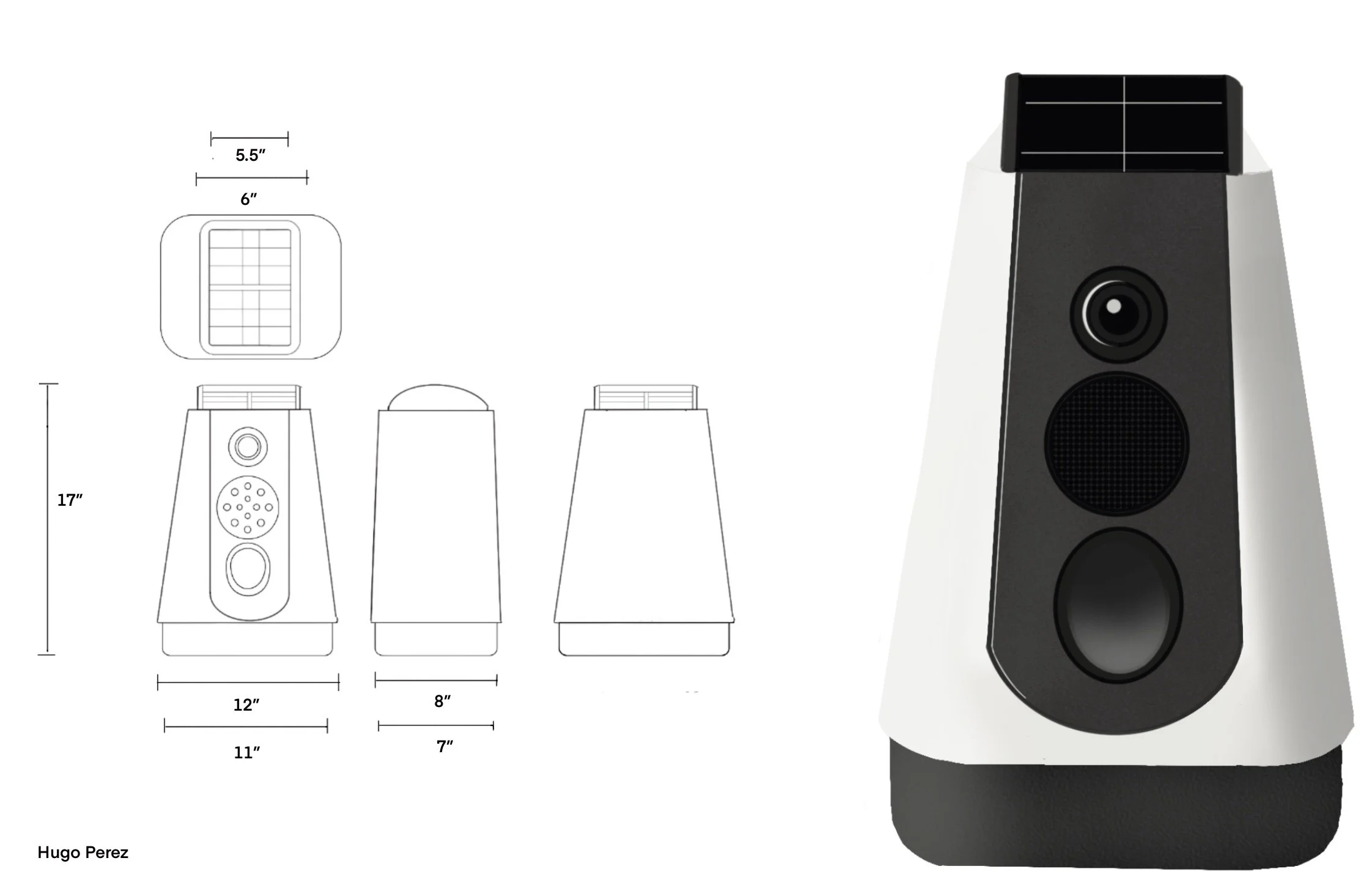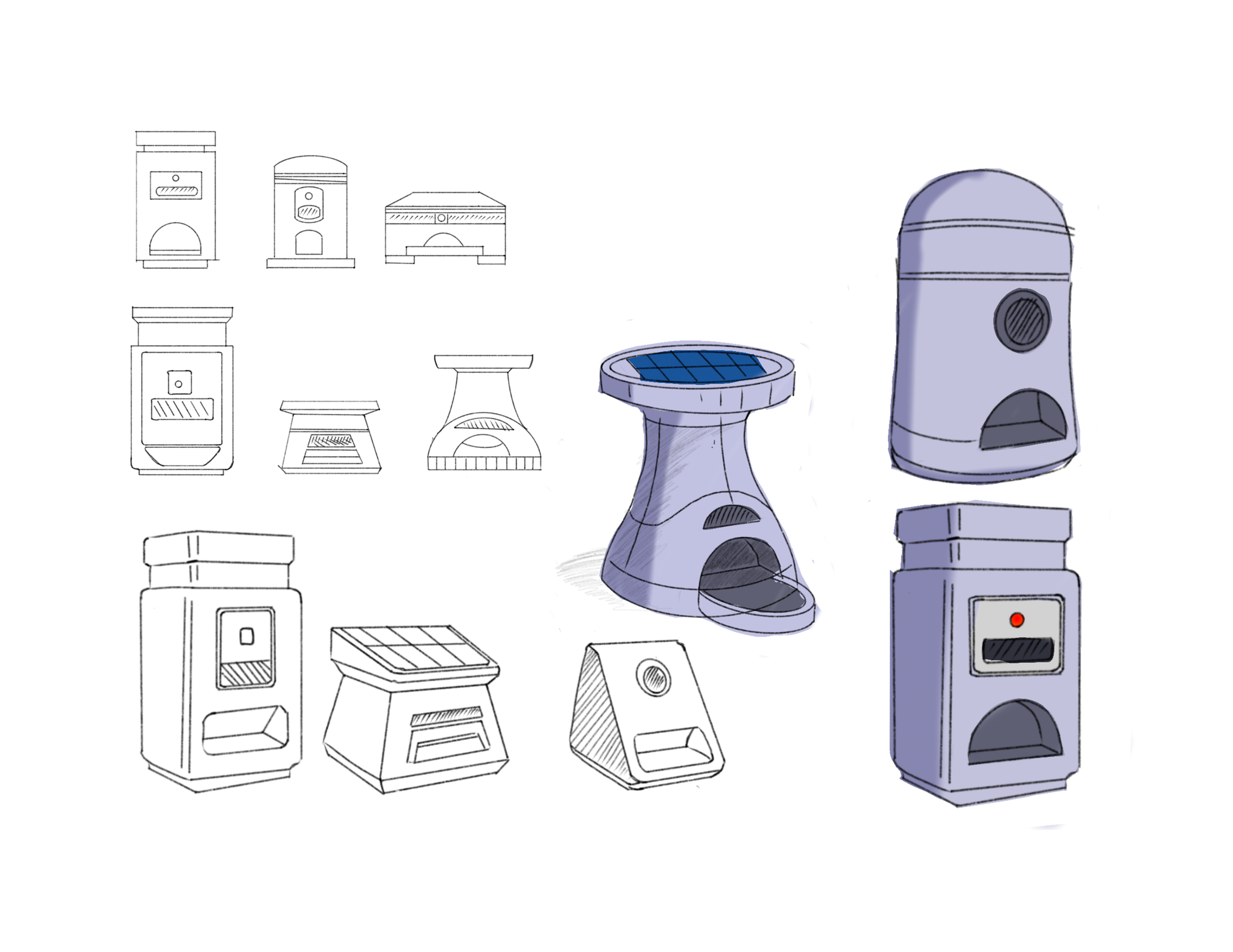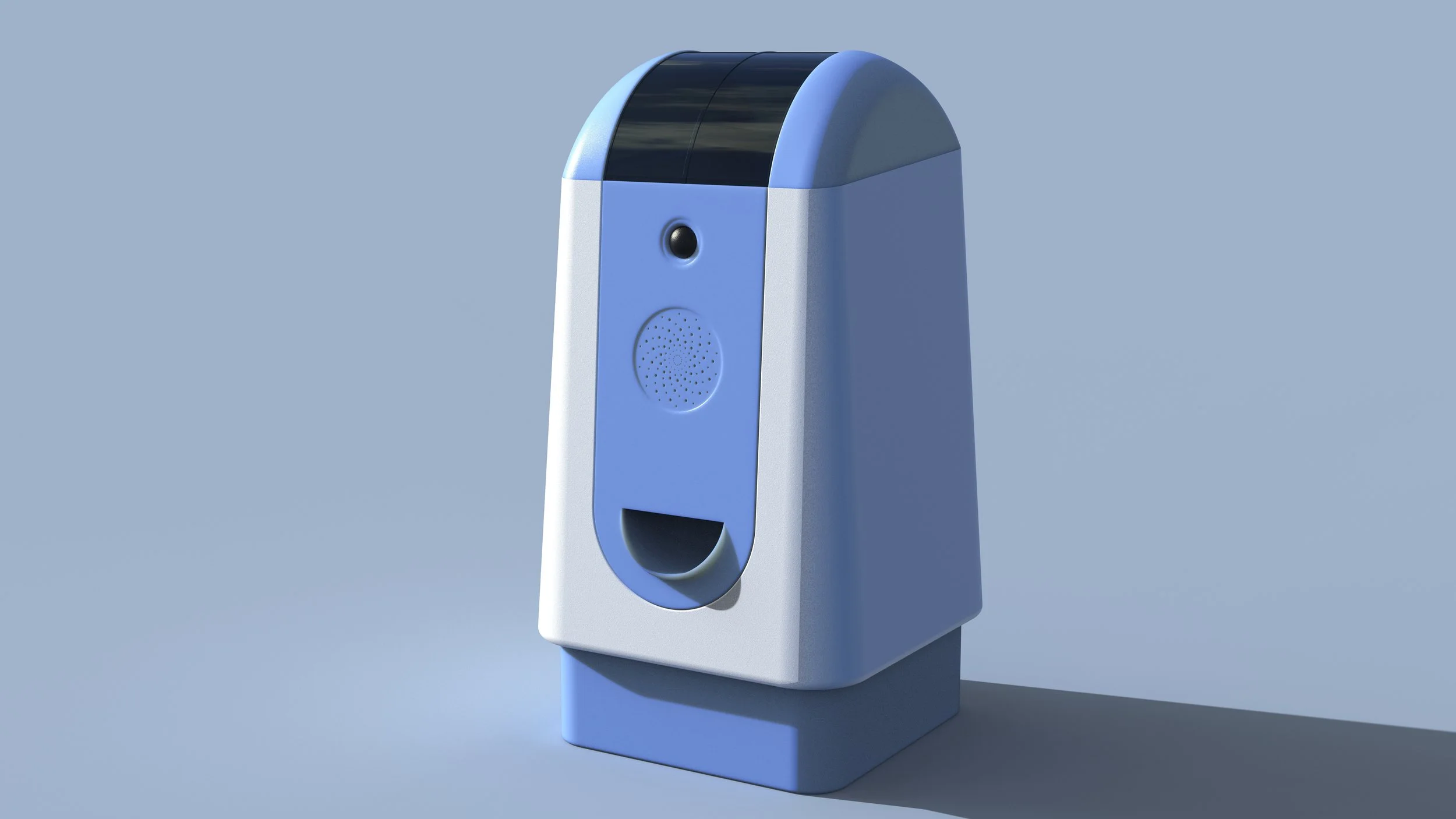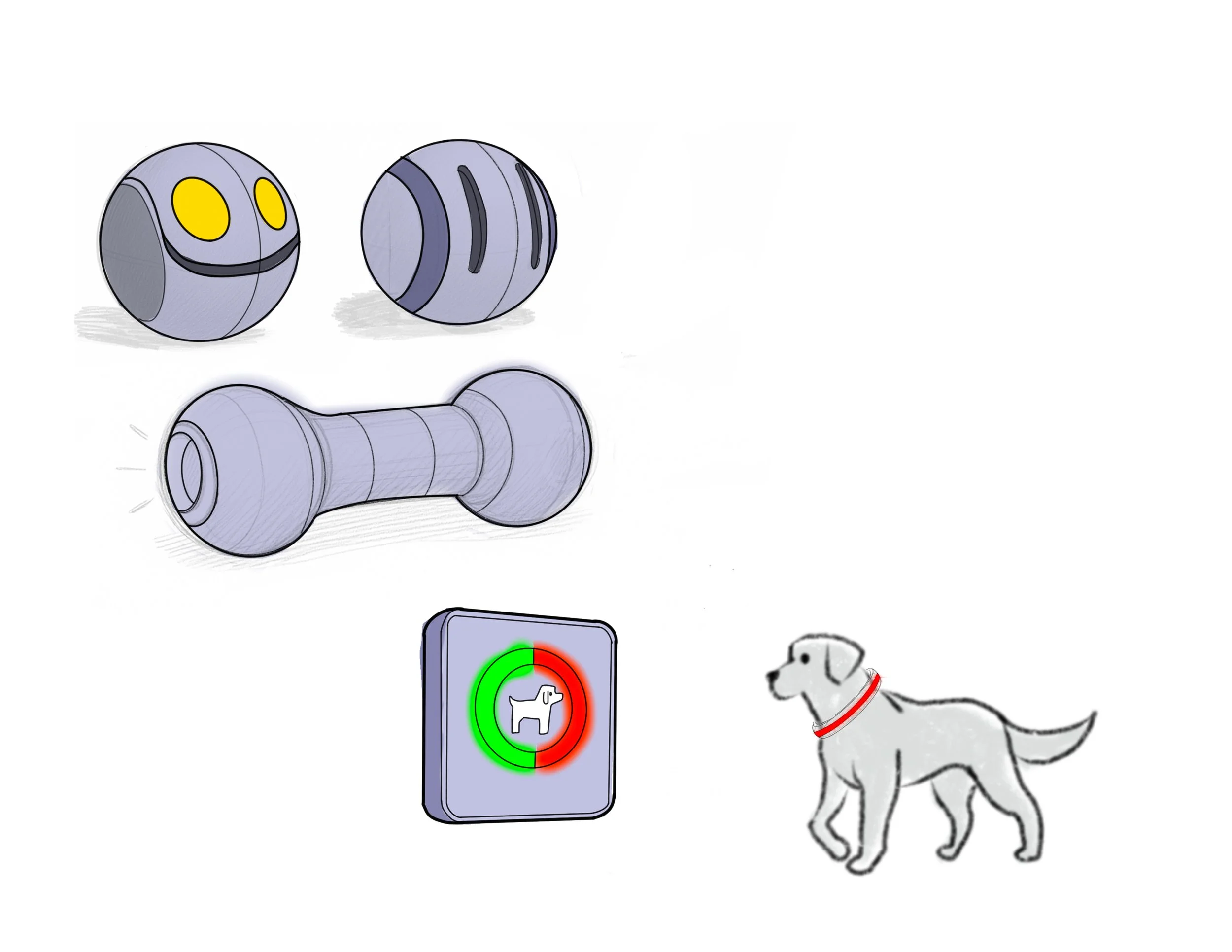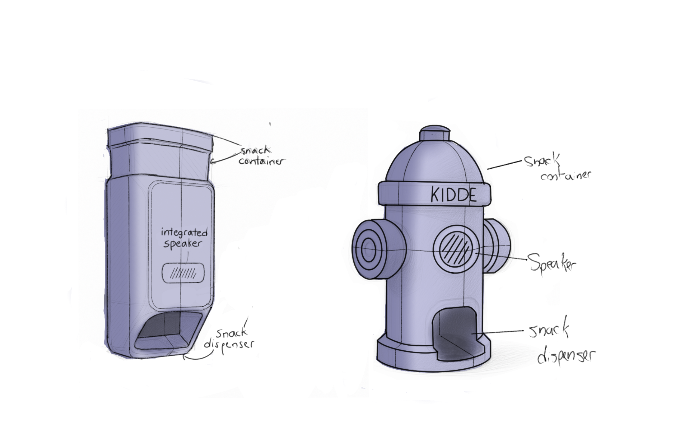 This final sketch phase refined the chosen direction into a production-aware form. I resolved proportion, hierarchy of components, speaker placement, camera, and treat dispensing access.