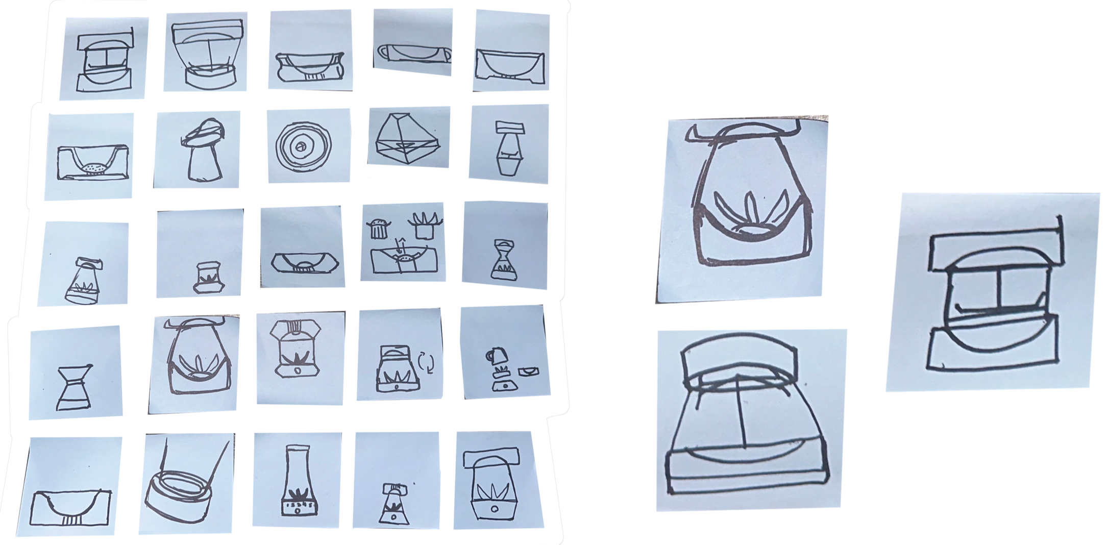 This phase explored how the grinder and pour-over could connect within a single system. Rapid sketches tested different proportions, transitions, and structural relationships between the two components.